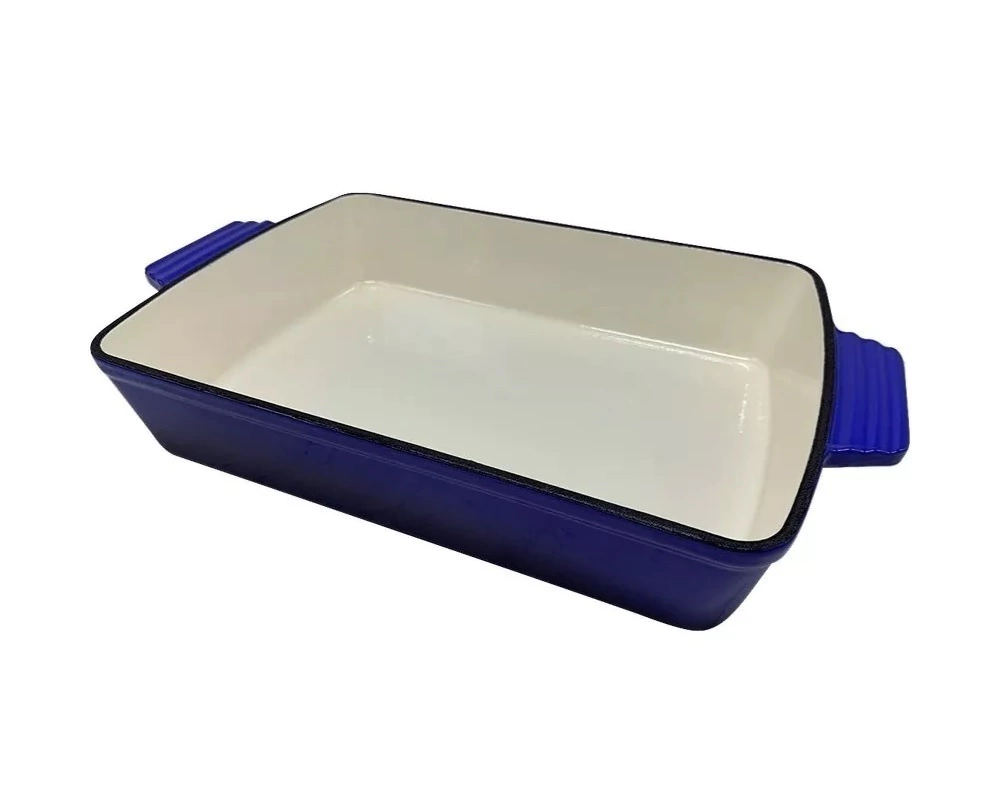Asadera de hierro esmaltado 30 cm Material: hierro fundido esmaltado Color: azul Medidas: 30 cm × 21 cm × 6,6 cm Medidas con asas: 36 cm × 21 cm × 6,6 cm Capacidad: 2,5 l Espesor: 5 mm Peso: 3,3 kg